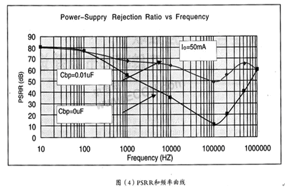 電源抑制比PSRR(Power supply ripple rejectionratio)是反應(yīng)LDO輸出對輸入紋波抑制能力的一個交流參數(shù),一般輸出和輸入的頻率是一樣的,PSRR的值越大說明LDO的紋波能力越強,也就是說輸入對輸出的影響很小。盡管LDO的電源抑制比很強,但都是在一定頻率內(nèi)的抑制很強,一般的在50KHz到200kHz的電源抑制比還是很差的如圖(4)為SGM2007的PSRR和頻率曲線,而這段頻率正是大多數(shù)開關(guān)電源的工作頻率,如果LDO的負載和輸入輸出電容匹配不好,很容易引起LDO振蕩。而造成整個LDO供電系統(tǒng)的不穩(wěn)定。