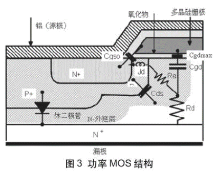 MOSFET的物理結(jié)構(gòu)導(dǎo)致其端口之間形成電容。金屬氧化物柵極結(jié)構(gòu)決定了柵極到漏極(Cgd)以及柵極到源極(Cgs)的固有電容。漏極和源極之間的PN結(jié)(Cds)是因P+體的存在而產(chǎn)生,其中MOS單元建立在N+襯底頂部上的外延層附近。