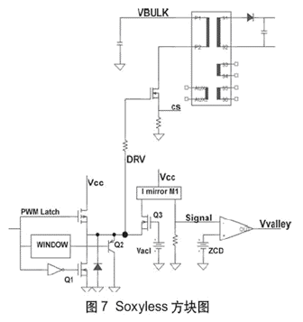 Soxyless模塊的主要功能為:啟動PNP;禁用推挽驅(qū)動器的下部NFET;在漏極電壓振蕩的負dV/dt部分在驅(qū)動器輸出DRV上形成“虛擬地”;捕獲(流出DRV輸出端的)負電流;檢測“正向ZCD DRV電流”。