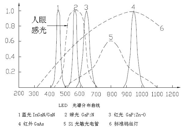 LED 的光譜分布與制備所用化合物半導體種類、性質及pn結結構(外延層厚度、摻雜雜質)等有關,而與器件的幾何形狀、封裝方式無關。