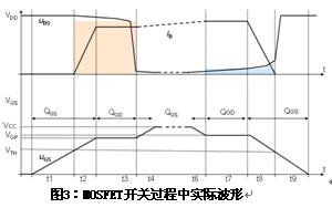 圖1中VDS的電壓波形是基于理想狀態下,用工程簡化方式來分析的。由于Coss存在,實際的開關過程中的電壓和電流波形與圖1波形會有一些差異,所圖3所示。下面以關斷過程為例說明。基于理想狀態下,以工程簡化方式,認為VDS在t7時間段內線性地從最小值上升到輸入電壓,電流在t8時間段內線性地從最大值下降到0。