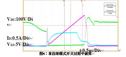 注意到圖1是基于連續電流模式下所得到的波形,對于非連續模式,由于開通前的電流為0,所以,除了Coss放電產生的功耗外,沒有開關的損耗,即非連續模式下開通損耗為0。但在實際的檢測中,非連續模式下仍然可以看到VGS有米勒平臺,這主要是由于Coss的放電電流產生的。Coss放電快,持續的時間短,這樣電流迅速降低,由于VGS和ID的受轉移特性的約束,所以當電流突然降低時,VGS也會降低,VGS波形前沿的米勒平臺處產生一個下降的凹坑,并伴隨著振蕩。