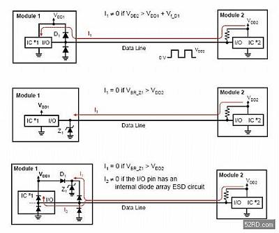 突崩式TVS二極管雖然擁有高突波規(guī)格,但相對較大的電容值使得這類元件成為負(fù)載切換開關(guān)與直流電源匯流排保護(hù)應(yīng)用的較佳選擇,相反地,二極管陣列適當(dāng)?shù)耐徊ㄒ?guī)格與較小的電容值則較適用于高速資料連接線的保護(hù),突崩式TVS與二極管陣列通常可以交互使用,但部份電路在選擇適合採用的元件時(shí)則需要經(jīng)過仔細(xì)的分析。(圖四)描述了當(dāng)存在一個(gè)電流可以透過資料線流經(jīng)二極管陣列路徑時(shí)所發(fā)生的向后驅(qū)動(dòng)問題,如果VDD2大于VDD1,那么資料連接線有可能意外地提供電源給模組1,這個(gè)情況可能會造成邏輯晶片的電源啟動(dòng)問題,或是在斷電后模組1上指示燈被點(diǎn)亮的異常狀況。