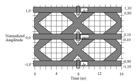本次測試將主要驗證產品上4個以太網100Base-TX接口的技術指標。對于其中比較直觀的100Base-TX物理層的眼圖模板,《ANSI+X3_263-1995》標準中有著明確的眼圖模板定義見圖2。