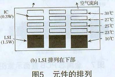 熱性能相同發熱元器件布置:圖5顯示PCB上安裝IC(0.3W),LSI(1.5W)時溫度上升的實測值。按圖5(a)排列,IC的溫度上升值是18℃-30℃,LSI溫度上升值是50℃。按圖5(b)排列,LSI溫度上升值是40℃,比圖5(a)排列還要低10℃。