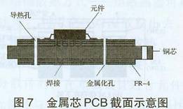 金屬板嵌入多層印制板的中間,其典型結構如圖7金屬芯板本身也可作為地層使用,其上下層可通過金屬化孔(與芯板絕緣)互聯,并通過導熱孔實現熱量在金屬芯板內層和表面的傳遞。如圖7所示,發熱元件可通過底部和導熱孔直接焊接在板面上,發熱器件產生的熱直接傳遞到金屬芯板,由金屬芯板經導熱孔傳給接觸的安裝機箱而散發出去;熱量較大時可銑去芯板兩邊的絕緣層,通過邊緣裸露的金屬芯板與機座接觸散熱,因此具有良好的散熱效果。對處于密閉機箱中的電路散熱是一種較好的選擇金屬芯PCB的芯材通常有鋁、銅、鋼等,后來開發出了覆銅因瓦復合材料(CIC),它不僅具有良好的導熱性,而且其熱膨脹系數與半導體器件匹配性好,所制成的CIC金屬芯板可應用于要求高可靠性、高組裝密度、高功率、高性能的軍用電子設備中。