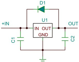 另一個動態性能變量是輸出噪聲。通過增加穩壓器輸出端的濾波器電容一般可以降低輸入紋波和輸出噪聲,但是會延長瞬態恢復時間。線性穩壓器的運行依賴于一個內部增益級。為了防止該增益級出現振蕩,通常會需要一個最小輸出濾波器電容(請參見圖1中的C2)。一個輸入濾波器電容(請參見圖1中的C1)將有助于穩壓器服務于瞬態負載,尤其是在穩壓器遠離電源時更需要這樣一個輸入濾波器電容。許多穩壓器都不容許存在反向電壓。如果輸出電容被充電至輸出電壓,同時輸入短路至接地,那么穩壓器將出現反向電壓,并且在所有電路獲得放電以前穩壓器都會鎖閉在某種未知狀態中。這種故障狀態可能會引起穩壓器自毀。為了避免出現這種故障模式,可能會需要一個反向二極管鉗位(請參見圖3)。