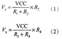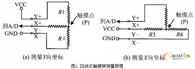 觸摸層的兩個(gè)金屬導(dǎo)電層分別用來測(cè)量X軸和Y軸方向的坐標(biāo)。用于X坐標(biāo)測(cè)量的導(dǎo)電層從左右兩端引出兩個(gè)電極,記為X+和X-。用于Y坐標(biāo)測(cè)量的導(dǎo)電層從上下兩端引出兩個(gè)電極,記為Y+和Y-。這就是四線電阻觸摸屏的引線構(gòu)成。當(dāng)在一對(duì)電極上施加電壓時(shí),在該導(dǎo)電層上就會(huì)形成均勻連接的電壓分布國(guó)。若在X方向的電極對(duì)上施加一確定的電壓,而Y方向電極對(duì)上不加電壓時(shí),在X平行電壓場(chǎng)中,觸點(diǎn)處的電壓值可在在Y+(或Y-)電極上反映出來,通過測(cè)量Y+電極對(duì)地的電壓大小,便可得知觸點(diǎn)的X坐標(biāo)值。同理,當(dāng)在Y電極對(duì)上加電壓,而X電極對(duì)上不加電壓時(shí),通過測(cè)量X+電極的電壓,便可得知觸點(diǎn)的Y坐標(biāo)。測(cè)量原理如圖1所示。