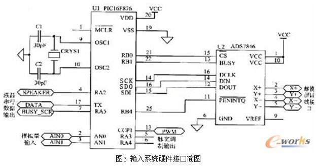根據(jù)ADS7846與微控制器進(jìn)行數(shù)據(jù)交換的接口特征,選用PIC16F876的SPI口。SPI口包括三個(gè)信號(hào):SDO(串行數(shù)據(jù)輸出),SDI(串行數(shù)據(jù)輸入),SCK(串行同步時(shí)鐘)。硬件連接關(guān)系見圖3。