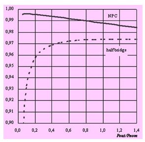 針對1000v直流母線電壓的光伏逆變器,npc拓撲結構逆變器是目前市場上效率最高的。圖12比較了npc模塊(mosfet+igbt)和使用1200v的igbt半橋模塊的效率。