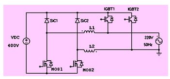 在圖13中,上橋臂igbt的開關頻率一般設定為電網頻率(例如50hz),而下橋臂的mosfet則工作在較高的開關頻率下,例如 16khz,來實現輸出正弦波。仿真顯示,這種逆變器拓撲在2kw額定功率輸出時,效率可以達到99.2%。由于mosfet內置二極管的速度較慢,因此 mosfet不能被用在上橋臂。