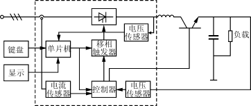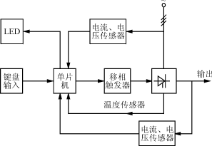 較為完整的ITPM一般由電力晶閘管,移相觸發(fā)器,軟件控制的單片機(jī),電流、電壓、溫度傳感器以及操作鍵盤,LED或LCD顯示等部分組成。如圖1所示。
