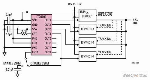 硅振蕩器為多相、擴頻開關(guān)穩(wěn)壓器時鐘提供了一個理想的平臺。除了具有一個板上時鐘發(fā)生器之外,這些固態(tài)器件還能將擴頻調(diào)制與多相輸出組合起來。考慮到這一點,凌力爾特公司開發(fā)出了LTC6909(圖1),這是一款具有8個單獨多相輸出的精準擴頻硅振蕩器。單個電阻器負責在12.5kHz至 6.67MHz的范圍內(nèi)選擇輸出頻率。三個邏輯輸入用于設(shè)定輸出相位關(guān)系(范圍從45°至120°),從而允許LTC6909為多達8個相位提供同步。可以啟用一種偽隨機擴頻調(diào)頻,頻率擴展量在中心頻率的±10%。用戶可選擇3種調(diào)制速率之一,以確保調(diào)制速率不超過穩(wěn)壓器的帶寬。此外,LTC6909還具有一個創(chuàng)新的濾波器,該濾波器負責跟蹤SSFM調(diào)制速率并在頻率轉(zhuǎn)換之間提供平滑處理。