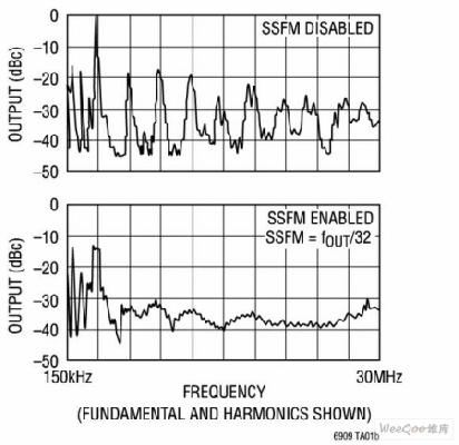 除了多相同步之外,還可以通過連續(xù)改變開關(guān)穩(wěn)壓器時鐘的頻率來改善EMI。這種被稱為SSFM的技術(shù)不允許發(fā)射能量在任何接收器的頻段中停留過長的時間,從而改善了EMI。為了最大限度地發(fā)揮SSFM的效用,主要有4個必需考慮的因素:受影響接收器的帶寬、頻率調(diào)制的方法、頻率擴展量和調(diào)制速率。