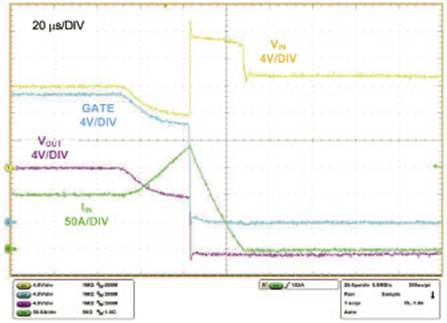 由于在檢測到故障之前允許建立起盡可能高的電流,圖1中電路的輸出兩端直接拉低的零阻抗短路尤其麻煩。在短路故障響應時間之后,通路MOSFET最終是由“斷路器”故障條件下的熱插拔控制器命令關(guān)閉的,同時正向電流迅速被中斷。