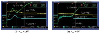 在不同的柵級(jí)電壓下測(cè)量短路電流,測(cè)試波形如圖2所示,采用的功率MOSFET為AOT266。圖2(a):VGS電壓為13V,短路電流達(dá)1000A,MOSFET在經(jīng)過(guò)47μs后電流失控而損壞;圖2(b):VGS電壓為8V,短路電流僅為500A,MOSFET在經(jīng)過(guò)68μs后電流失控而損壞。電流測(cè)試使用了20:1的電流互感器,因此電流為200A/格。