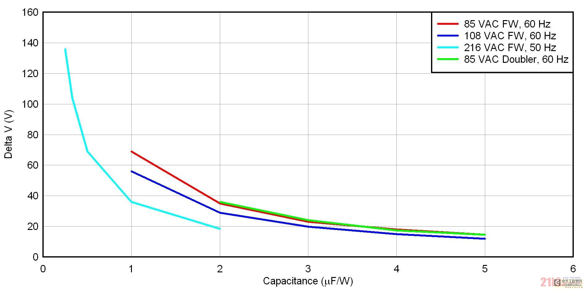 [page]圖 3 顯示了四種整流器/輸入電壓方法的 uF/W 標準化壓降。共有三種全波橋接方法,適用于低線壓美國(108 VAC/60 Hz)、低線壓日本(85 VAC/50 Hz)和低線壓歐洲(216 VAC/50 Hz)。另外,還有一個低線壓日本的倍壓器。就全波橋而言,標準化過程只需將電容除以功率。在倍壓器中,標準化方法是將兩個串聯電容之一的電容除以功率。要想使用該曲線圖,請首先確定您的整流器配置結構,并選擇一個可以接受的壓降。之后,您只需讀取輸入電容的 uF/W 便可。最后,通過乘以您的功率,便可去標準化。
