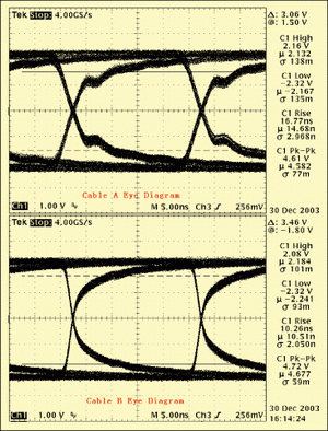 圖4是實際應用的眼圖情況,很明顯電纜B的眼圖要比電纜A的眼圖要好,和前面的仿真結果比較吻合,不過電纜A的實際反射比較大一點,這和仿真使用驅動器件的模型有關。