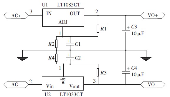 LT1083/LT1033 系列正負可調穩壓器的效率大大高于現有器件,可以提供7.5 A、5 A 和3 A 輸出電流,并能在低至1 V 的壓差條件下運行,壓降在最大電流條件下保證在1.5 V 以內。負載電流減小時允許壓差同時減小,可在多種電流水平條件下通過片內修整電路,提供所保證的最小壓差,并能夠使輸出電壓準確度調節至1%.其電壓調整率為0.015%,負載調整率為0.01%,對電流限值也進行了修整,最大限度地減小了過載條件下穩壓器和電源電路上承受的應力,具有熱功耗限制保護[10].LT1083/LT1033 系列器件的引腳與老式三端穩壓器兼容,與大多數穩壓器設計中的10 μF 輸出電容器以及PNP 穩壓器多達10%的輸出電流作為靜態電流消耗不同,LT1083/LT1033 系列的靜態電流流入負載, 大大降低了電源功耗。此芯片電壓調整率小、負載調整率小的特點能夠保證輸出電壓穩定度高。正負線性穩壓模塊電路如圖3 所示,其中R1=R3,R2=R4.電路中的電阻參數可根據輸出可調電壓公式確定: