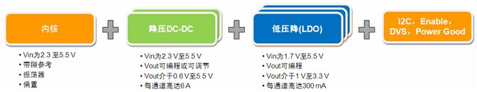 安森美半導(dǎo)體提供一系列的微型電源管理IC(mini-PMIC),其功能示意圖參見(jiàn)圖1。這些微型電源管理IC集成多個(gè)DC-DC開(kāi)關(guān)轉(zhuǎn)換器或低壓降(LDO)線(xiàn)性轉(zhuǎn)換器,同時(shí)還可能集成其它多種控制或保護(hù)功能等,如總線(xiàn)控制、排序器、功率良好(PG)監(jiān)控、啟用(Enable)、帶隙參考、振蕩器、欠壓鎖定及熱關(guān)閉等保護(hù)功能或動(dòng)態(tài)電壓調(diào)節(jié)(DVS)等。安森美半導(dǎo)體的mini-PMIC目前包括NCP6922、NCP6914、NCP6924及NCP69xy等(功率及功能遞增)。