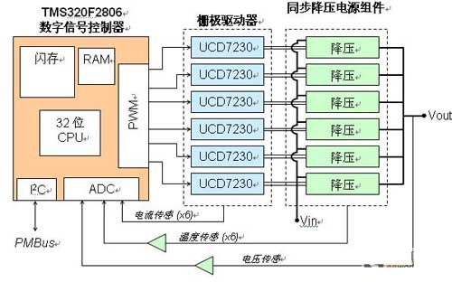 TI推出的32位TMS320F2806數(shù)字信號(hào)控制器(DSC)運(yùn)行在100MHz頻率下,并且以電源應(yīng)用為目標(biāo)。在本例中,其在軟件中實(shí)施電壓模式控制,該軟件使用一個(gè)在PWM開關(guān)頻率上進(jìn)行采樣的單通道2極點(diǎn)2零點(diǎn)數(shù)字補(bǔ)償器。隨后產(chǎn)生的占空比值將被傳給每一個(gè)降壓相(所有為實(shí)現(xiàn)相位平衡所作的占空比調(diào)節(jié)除外)。通過(guò)使用片上12位模數(shù)轉(zhuǎn)換器(ADC)獲得系統(tǒng)輸出電壓反饋。MOSFET溫度在整個(gè)ADC中均為可用,以實(shí)現(xiàn)監(jiān)控的目的,并且片上內(nèi)部集成電路(I2C)端口提供了對(duì)PMBus™通信的支持。針對(duì)同步降壓應(yīng)用專門設(shè)計(jì)了一款UCD7230柵極驅(qū)動(dòng)器,從而提供了采用TITrueDrive™輸出架構(gòu)的雙通道4-AMOSFET驅(qū)動(dòng)器、周期性電流限制以及一個(gè)內(nèi)置低失調(diào)、高增益、差分電流傳感放大器。