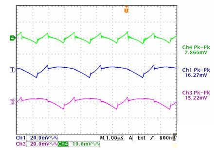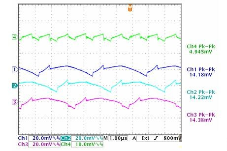 圖2a顯示了一款120°交錯(cuò)式(條件:10V輸入、2V輸出、3A負(fù)載及300kHzPWM開關(guān))PWM結(jié)構(gòu)的三相交錯(cuò)式降壓轉(zhuǎn)換器的示波器屏幕采集圖。示波器通道1至3顯示的是單個(gè)相位電壓,而通道4顯示的是交錯(cuò)式輸出電壓(所有示波器通道均為AC耦合)。通過(guò)所有運(yùn)行中的三個(gè)相位,可以得出該輸出紋波為4.9mV(輸出電壓的0.25%)。在沒有調(diào)整兩個(gè)剩余相位(見圖2b)角的情況下,切除相位2會(huì)引起輸出紋波增加86%,即為9.1mV。為了獲得180°交錯(cuò)(見圖2c),對(duì)兩個(gè)剩余相位進(jìn)行軟件調(diào)整以后,該紋波減少至7.9mV。在仍然比初始值大的同時(shí)(因?yàn)橐粋€(gè)兩相位系統(tǒng)無(wú)法獲得如一個(gè)三相系統(tǒng)一樣的低紋波),其比未被調(diào)整的剩余相位角提高了13%。