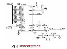 在主振預置電路D/A部分,為了照顧2-20GHz全頻段能有較為精細的預置分辨率,并且滿足△Data插值需要,在此選擇了14位D/A轉換器,使用時在數據范圍0~16383兩端預留一定的插值空間,電路如圖6所示。