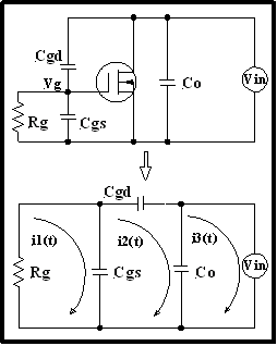 當LS MOSFET由門極驅動器關閉而HS MOSFET正被打開時,就會遇到擊穿損耗。在轉換期間,門極-漏極間電容通過由Cgd和Rg//Cgs組成的潛在的分壓器把漏極電壓耦合到門極。如果這個耦合電壓大于門限電壓Vgth,那么,LS MOSFET將為打開,從而產生一條流過HS和LS MOSFET的低阻的電流通路,最終造成過度損耗。支配相對于地的門極電壓的方程如下所示: