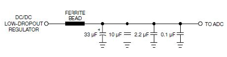 隔離來自ADC開關噪聲的一個關鍵元件是電源濾波器,它包括一個鐵氧體磁環和旁路電容。在選擇鐵氧體磁環時應考慮多個關鍵特性。首先,鐵氧體磁環必須有用于數據轉換器的充足額定電流,它必須有低的DCR(直流阻抗),以盡量減少磁環自身的壓降。例如,當一個200mA電源通過一個DCR為1Ω的磁環時,產生一個200mV的壓降。這個壓降可能將ADC上的電壓推至邊沿,考慮到電源電壓的標準差,ADC電壓甚至可能低于建議的工作電壓?! ?br />