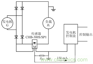 在某型地面車輛上裝備了一套獨(dú)立的大功率發(fā)電系統(tǒng),該發(fā)電系統(tǒng)設(shè)計選用了CHB-300S型閉環(huán)霍爾電流傳感器作為系統(tǒng)電流檢測部件,通過對傳感器的輸出信號進(jìn)行處理,設(shè)定限流工作點(diǎn),確保發(fā)電系統(tǒng)的輸出功率不高于發(fā)電機(jī)的額定功率。閉環(huán)霍爾電流傳感器CHB-300S的應(yīng)用,很好地實現(xiàn)了上述應(yīng)用目的。如圖3所示,發(fā)電機(jī)G輸出正端匯流母線穿過CHB-300S/SP1的原邊電流穿孔,由傳感器CHB-300S/SP1檢測發(fā)電機(jī)的輸出電流,傳感器的輸出IM與發(fā)電機(jī)控制盒相連,由發(fā)電機(jī)控制盒設(shè)定發(fā)電機(jī)的輸出電流控制點(diǎn),依據(jù)此信號,對發(fā)電機(jī)的輸出電流加以限制,避免發(fā)電機(jī)因輸出功率過高而發(fā)生故障或損壞,從而保證發(fā)電系統(tǒng)正常工作。