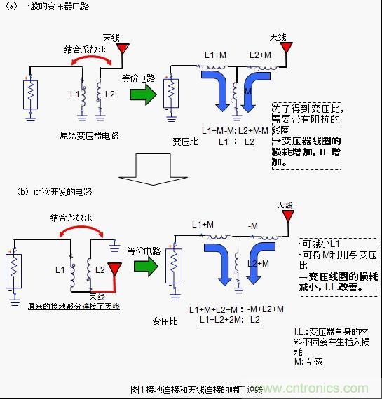 為了削減這種阻抗成分并維持變壓比,我們采用了圖1所示的高頻變壓器的構造。該構造跟普通的變壓器構造相反,它將接地連接端口跟天線連接端口完全逆反。因此,才能達到如圖1所示的變壓比。使用該構造的話,因結合產生的互感M值會反應到變壓器,變壓器中使用的線圈L值會減小,由于高頻變壓器的阻抗成分I.L.可以被抑制得很小。