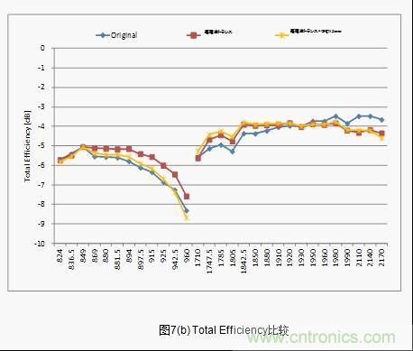 結果顯示,low band 情況下LC電路和高頻變壓器都不可能達到「S11<-6dB」(反射損耗1.2dB)。而high band情況下,達到「S11<-6dB」范圍的,如果使用LC電路的話是300MHz,而使用高頻變壓器的話則是500MHz,達到了66%的改善效果。(圖6(c)) 。此外,LC電路和高頻變壓器中天線的綜合特性顯示「Total Efficiency」,low band的高頻側也得到了0.6dB的改善效果。(圖6(d))。這種改善效果正是由于帶寬的廣帶寬化和I.L.得到了改善。