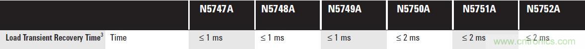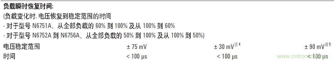 直流電源的瞬態(tài)響應時間快慢和跌落的幅度不盡相同。例如,安捷倫N6705B直流電源分析儀中所用的高性能模塊N675xA, 瞬態(tài)響應指標如下: