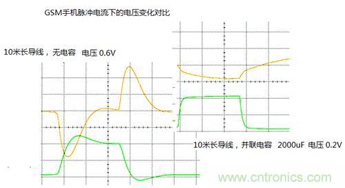 在加入電容后,對提升電路的瞬態(tài)響應能力,往往會起到比較明顯的效果。如圖4所示的,我們在用一個通用電源測量GSM手機脈沖電流,在沒有并聯(lián)電容的時候,瞬間電源跌落會達到0.6V (見圖4左). 對于一個工作在3.8V的手機來說,這樣大的電源跌落足以造成手機自動關機。當我們并聯(lián)了一個2000uF的電容后,電源跌落降到了0.2V以下,得到明顯改善,見圖4右所示(圖中,黃色曲線為電壓,綠色曲線為電流)。