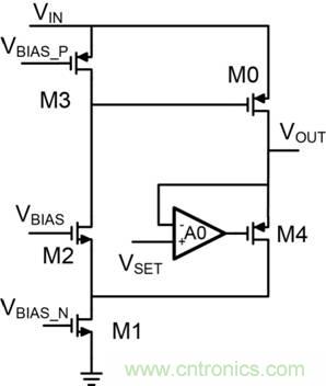 圖3:M4位于放大器反饋環(huán)路中、無輸出電容器的LDO。