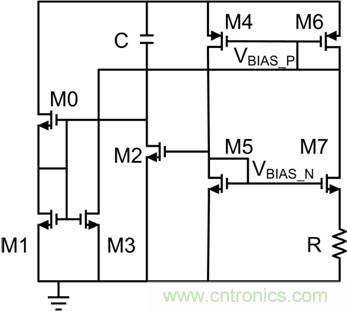 偏置發(fā)生器通常不需要特別啟動電路,這可減少靜態(tài)電流和占用面積。如果電流足夠小,電阻R 就可以忽略。由M5/M7和M4/M6構成的兩個電流鏡可互連成一個閉環(huán)。