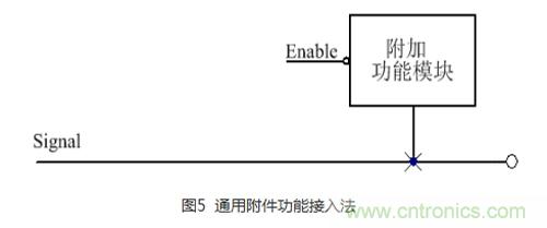 在高速信號線上,通常會附加一些功能,這些功能通常會帶來不利的影響,如會產(chǎn)生很大的寄生電容,這個電容視具體的電路模塊而定。如果忽略這個電容,可能會影響這個信號的頻率。最不幸的是,就算您注意到了這個電容,由于附加的功能模塊產(chǎn)生的電容太大,似乎也無能為力。通用附件功能接入法如圖5所示: