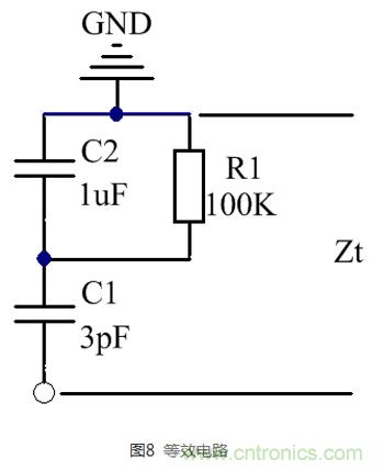 不管正向還是反向接入法,其等效電路都如圖8所示。我們假設(shè)二極管的節(jié)電容為3pF,附件功能模塊寄生總電容1uF。如果電阻足夠大,那么可以忽略,此時就是兩個電容串聯(lián),和電阻并聯(lián)類似,CT=C1*C2/(C1+C2)≈C1(C2較大)。大電容就算變化很大,串聯(lián)總電容幾乎等于小電容,即3pF,有效減小接入電容。