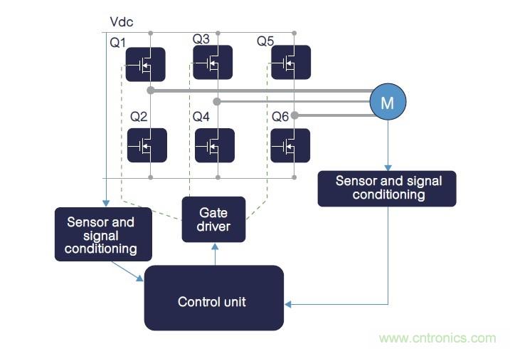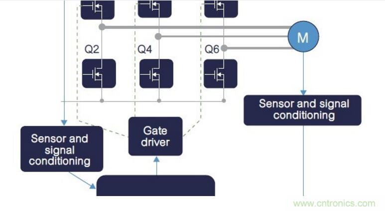 在電橋拓撲內(nèi),反向恢復(fù)過程從下橋臂開關(guān)(圖7中的Q2)續(xù)流結(jié)束時開始,到上橋臂開關(guān)(圖7中的Q1)開始導(dǎo)通時終止,且最終的恢復(fù)電流加到上橋臂電流內(nèi)。連同上橋臂開關(guān)上的額外電流,下橋臂反向恢復(fù)過程與Vds≈0V到Vdc換向操作,可能會在下橋臂開關(guān)閘源電壓上產(chǎn)生雜散跳變電壓,因為下橋臂Ciss(輸入電容)是透過Crss(Miller電容)完成充電過程。