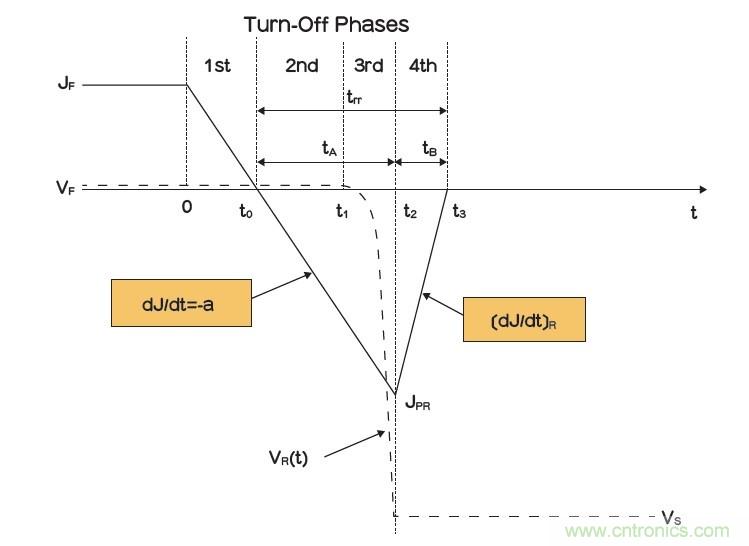 當(dāng)二極管正向偏壓變成反向偏壓時,電流不會立即降至零值,因為消除通態(tài)期間儲存的電荷需要時間。因此,當(dāng)t=t0時,二極管開始換向操作,電流開始下降,下降斜率(-a)恒定,外部電感和電源電壓是決定斜率的唯一因素。在t1之前,二極管被施加正向偏壓,從t1到t2,二極管壓降上升,達到電源電壓;在t=t2時,反向電流達到最大值。間隔(t3-t0)被稱為反向恢復(fù)時間(trr),而負電流與零線之間的區(qū)域是反向恢復(fù)電荷(Qrr)。tB期間的電流斜率主要與產(chǎn)品設(shè)計和硅特性有關(guān)。