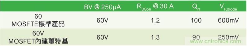 當(dāng)只有優(yōu)化Qrr和VF,diode才能提高系統(tǒng)總體性能時,集成肖特基二極管的新60V MOSFET是一個正確選擇。圖3列出了標準MOSFET和集成肖特基的功率開關(guān)的主要電參數(shù)(兩款產(chǎn)品的BVDSS和芯片尺寸相同)。