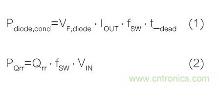 事實上,下橋臂體二極管導(dǎo)通損耗(Pdiode,cond)和反向恢復(fù)損耗(PQrr)與二極管正向壓降(VF,diode)及其反向恢復(fù)電荷(Qrr)密切相關(guān):