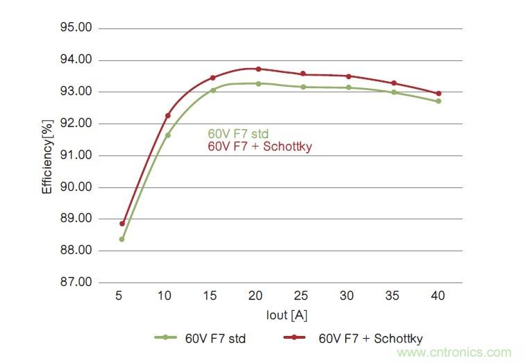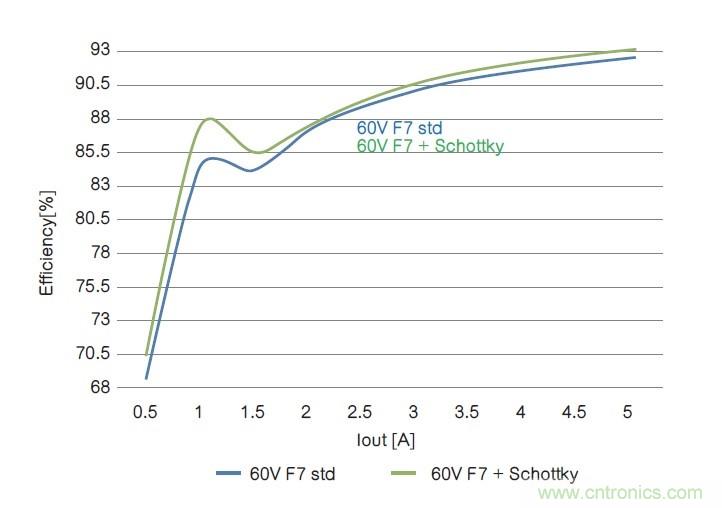 在兩個拓撲內(nèi),60V內(nèi)置肖特基二極管的器件在整個電流范圍內(nèi)性能表現(xiàn)更好,從而提高了系統(tǒng)總體性能。