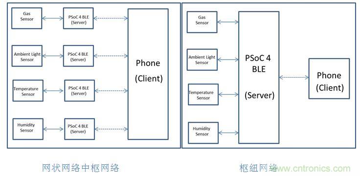 無線傳感器網(wǎng)絡(luò)通常作為網(wǎng)狀網(wǎng)絡(luò)和樞紐網(wǎng)絡(luò)(見圖1)。樞紐網(wǎng)絡(luò)包括可以放置在相同位置的所有傳感器。每個(gè)傳感器需要連接到單個(gè)BLE外圍設(shè)備(服務(wù)器)來處理數(shù)據(jù)并將其發(fā)送到BLE中央設(shè)備(客戶端)。網(wǎng)狀網(wǎng)絡(luò)采用可以遠(yuǎn)程定位傳感器的拓?fù)浣Y(jié)構(gòu)。網(wǎng)格中的每個(gè)節(jié)點(diǎn)都需要連接到BLE外圍設(shè)備(服務(wù)器),所有這些外圍設(shè)備都可以連接到BLE中央設(shè)備(客戶端)。
