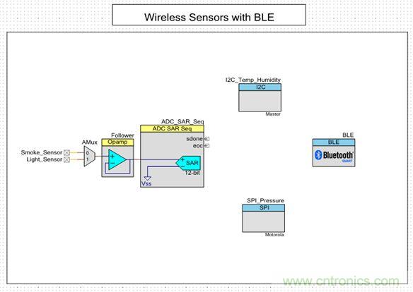 內(nèi)置BLE功能的處理器的靈活性和豐富資源,使傳感器能夠與單一BLE設(shè)備連接。圖2是使用PSoC Creator的典型配置。PSoC Creator是一個(gè)用于圍繞PSoC架構(gòu)開發(fā)應(yīng)用程序的IDE。圖中顯示的是模擬和數(shù)字傳感器接口以及BLE子系統(tǒng)。該配置展示的是用于感測煙霧、光照強(qiáng)度、溫度、濕度和壓力的典型工業(yè)數(shù)據(jù)監(jiān)測系統(tǒng)。配置中的每個(gè)組件都有一個(gè)關(guān)聯(lián)的應(yīng)用程序編程接口(API),開發(fā)人員可根據(jù)需要訪問這些組件。每個(gè)組件還有一個(gè)與其相關(guān)的數(shù)據(jù)表對組件的可用配置進(jìn)行說明。