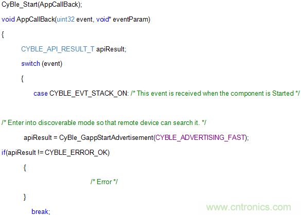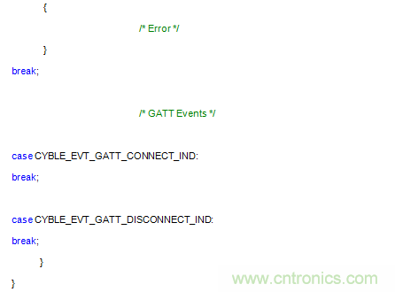 BLE中的一切都作為“活動(dòng)”處理。BLE堆棧提供處理這些事件的“定義”。以下代碼片段展示了其中一部分活動(dòng)的運(yùn)行。