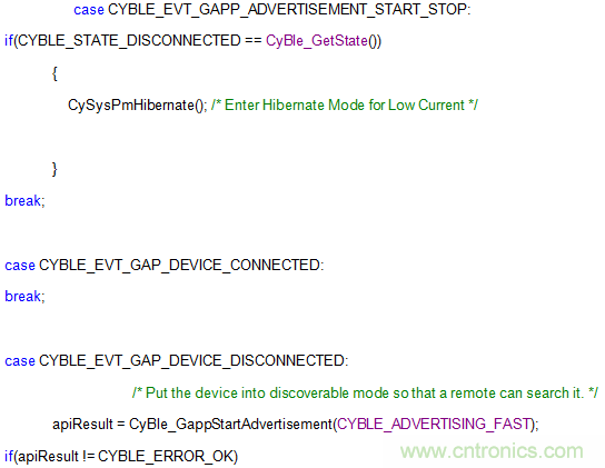 如上文所述,處理器和BLE子系統(tǒng)(BLESS)具有獨(dú)立的低功率模式。舉個(gè)例子,如果設(shè)備斷開連接,我們可以將處理器設(shè)置為休眠或停止模式以降低功耗。在廣播和連接間隔之間,我們可以利用BLESS深度睡眠模式,甚至連所使用的各個(gè)組件(如ADC、I2C等)也可以進(jìn)入各自的低功率模式并在需要時(shí)喚醒。因此,開發(fā)人員能夠根據(jù)整個(gè)系統(tǒng)的實(shí)際需要,對功率進(jìn)行非常細(xì)致的控制。有關(guān)詳細(xì)的低功率代碼片段,請點(diǎn)擊文末閱讀原文觀看低功耗藍(lán)牙應(yīng)用的低功率設(shè)計(jì)與電池壽命估算。
