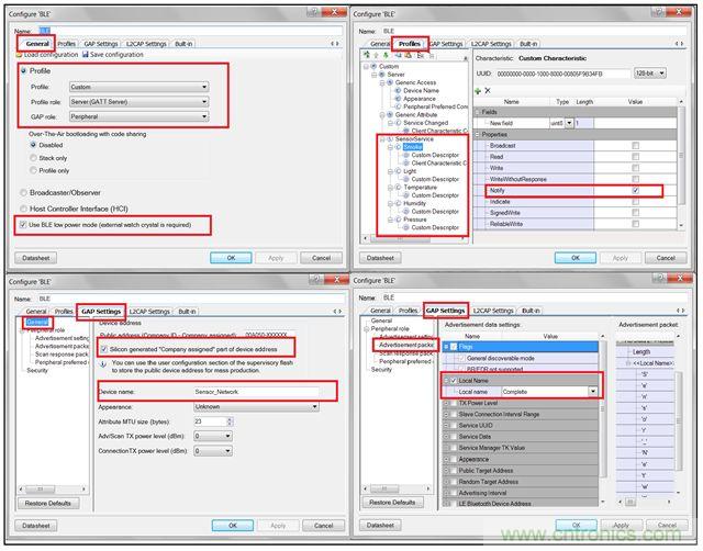 BLE組件在其GAP層中被配置為從設(shè)備。這使任何BLE設(shè)備(如BLE手機(jī))都可以掃描此設(shè)備,在BLE從設(shè)備包含其名稱廣播時(shí)被BLE手機(jī)連接。此外,在其GATT層中,BLE設(shè)備被配置為具有自定義配置文件的GATT服務(wù)器。下面將討論BLE低功耗特性在該組件內(nèi)啟用。名為“Sensor Service”的單一服務(wù)具有5種不同的特性,用于采集每個(gè)傳感器的數(shù)據(jù)。每個(gè)特性都具有通知功能,可以將傳感器數(shù)據(jù)作為通知發(fā)送。
