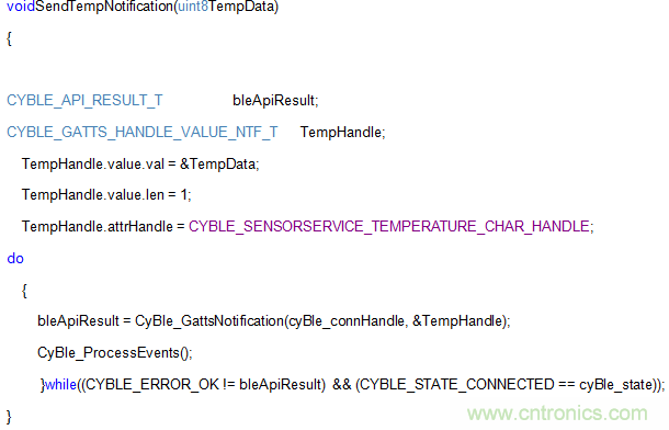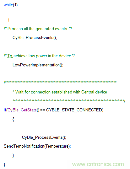 一旦兩個(gè)設(shè)備實(shí)現(xiàn)連接,就能使用連接間隔不同的通知發(fā)送數(shù)據(jù)。應(yīng)用程序接口“CyBle_ProcessEvents()”應(yīng)置于while(1)循環(huán)中,且必須在每個(gè)連接間隔中至少調(diào)用一次。我們也可以調(diào)用在同一while循環(huán)中將數(shù)據(jù)作為通知發(fā)送的函數(shù)。以下函數(shù)可用于將溫度數(shù)據(jù)的一個(gè)字節(jié)作為通知發(fā)送。這也適用于其他傳感器特性。