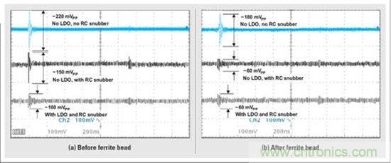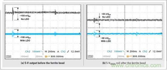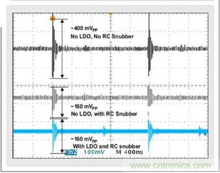 圖 3 實(shí)驗(yàn) 2(使用 LDO)和實(shí)驗(yàn) 3(無 LDO)的示波器截圖對(duì)比